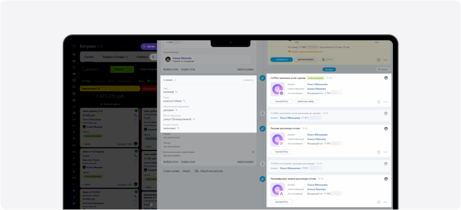 В CRM «Битрикс24» виртуальный помощник значительно упрощает управление клиентскими данными и улучшает процессы продаж. Он автоматически собирает и анализирует информацию о покупателях и даёт персонализированные рекомендации для дальнейших действий. Например, если клиент давно не проявлял активности, CoPilot предложит отправить ему специальное предложение или SMS-напоминание с помощью API-платформы МТС Exolve.