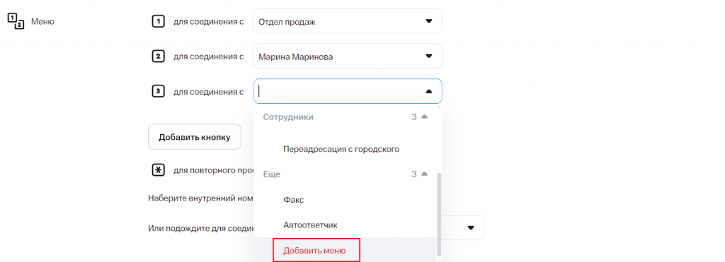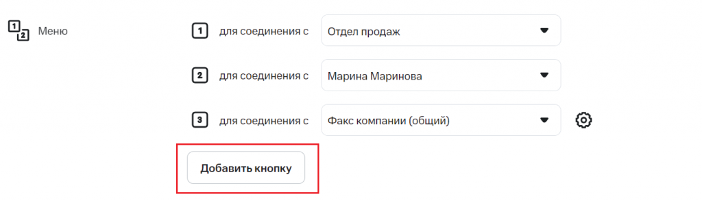Для настройки первого уровня задайте действия для кнопок. Например: «1 — поддержка», «2 — отдел продаж», «3 — автоответчик компании».