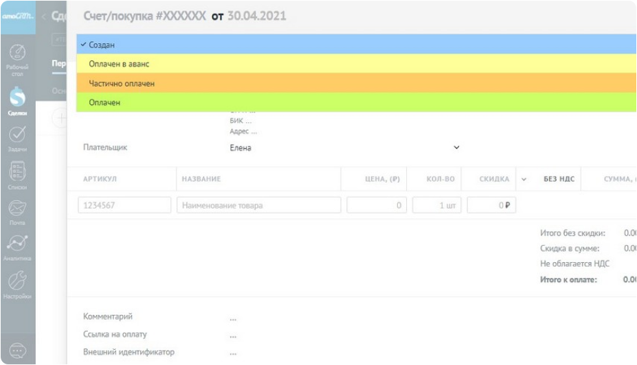 В amoCRM можно выставлять счета клиентам прямо из системы, не прибегая к дополнительным программам.