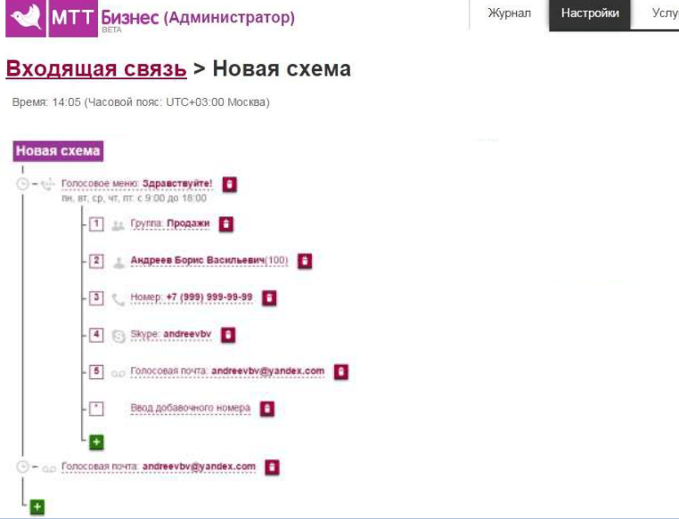 Для тонкой настройки необходимо создать новую схему. Рассмотрим алгоритм на простом примере: в рабочее время звонки обрабатывает автосекретарь, в нерабочее – голосовая почта или факс.